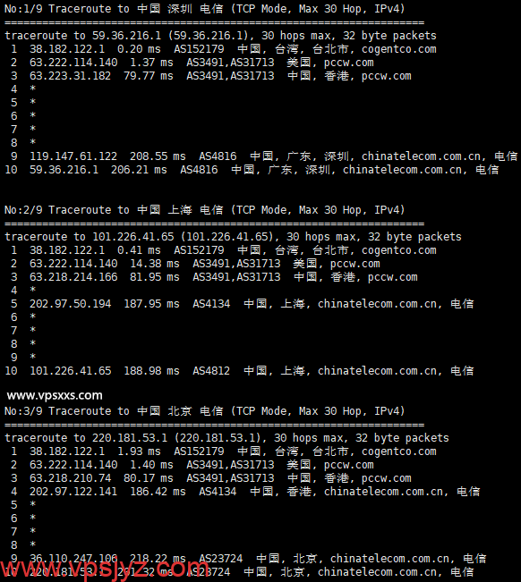 IPRaft台湾原生IP VPS到内地的平均延迟214ms,这肯定是绕路了,也正常,现在内地到台湾省机房基本都是绕路的。来看看具体的三网路由:
