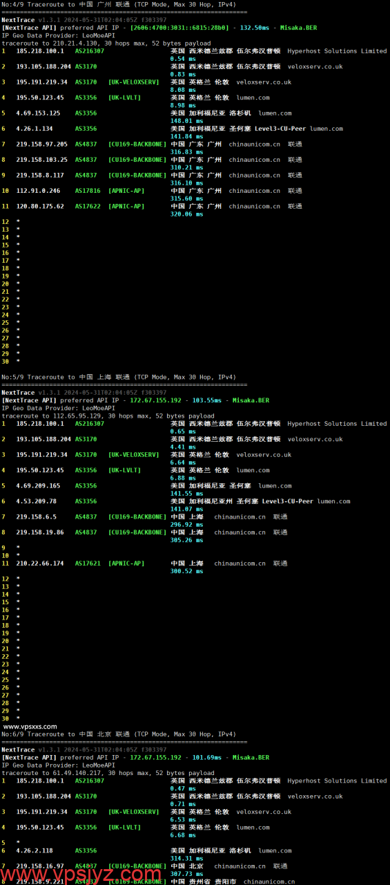 可以看到Hyperhost Solutions英国VPS电信去程是穿越美国到英国伦敦,回程倒是从英国直连回程;联通去程还是从美国绕过去,回程也是从美国绕回去;移动去程依然是走GTT从美国过去,回程是直连回程。等于只有电信移动回程直连,其他都绕美国。