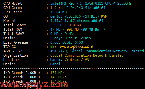 首先看一下IPRaft越南双ISP VPS的硬件测试。可以看到IPRaft越南双ISP VPS用的是Gold 6133处理器,单核2.50GHz的频率。读出来991M的内存,没有默认的虚拟内存。读出来9.8GB的硬盘,硬盘平均读写速度148MB/s。硬件整体性能平平无奇,没什么亮点,但是也没有特别拖后腿的。可以看到是KVM虚拟化,VPS小学生安装了原生BBR。