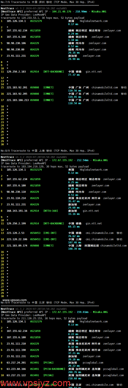 IPRaft越南双ISP VPS到国内的平均延迟342ms,延迟非常高啊,这肯定是绕路了。不过这也正常,现在越南机房到国内大多只有广移直连,其他基本都绕路。来看看具体的三网路由吧: