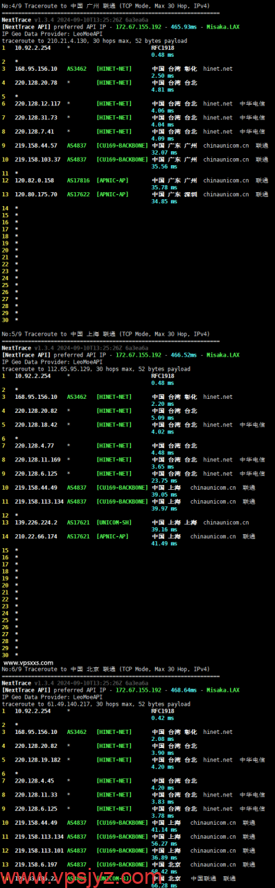 丽萨主机台湾双ISP住宅hinet动态IP VDS到内地的平均延迟84ms,非常低的延迟,而且物理距离越近延迟越低,这么低延迟的台湾机房服务器挺少见的。来看看具体三网路由: