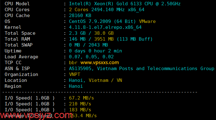 首先看一下TotHost越南GT服务器的硬件测试。可以看到是用的Gold 6133处理器,双核2.50GHz的频率,处理器性能不错。读出来3951M的内存,默认还有2043M的虚拟内存,默认给的内存挺适合中国用户的。因为虚拟内存是从硬盘挪用的,所以40GB硬盘读出来38GB,硬盘平均读写速度153MB/s,刚够用,硬盘差了点。可以看到是VMWare虚拟化的,注意不是KVM虚拟化的,不过VMWare虚拟化基本跟KVM没什么区别,而且方便使用Windows系统了,当然介意的话TotHost也有KVM VPS,参考VPS小学生之前的测评就可以了。